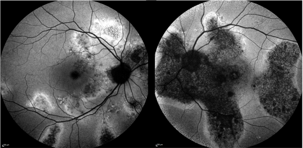 Les patients présentent des « cicatrices » typiques, qui se manifestent sous forme de « coulées gravitationnelles » au niveau de l’épithélium pigmentaire. Les patients concernés sont surtout des hommes et l’atteinte est souvent bilatérale.